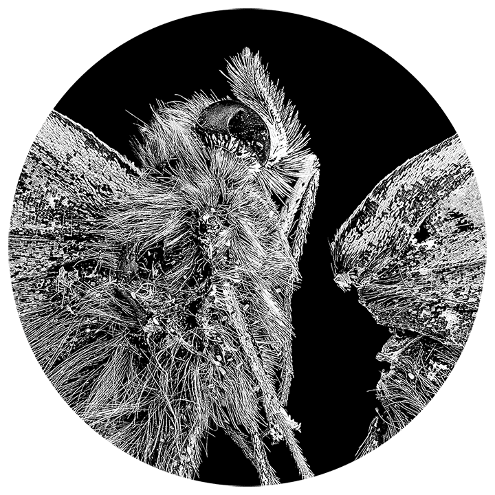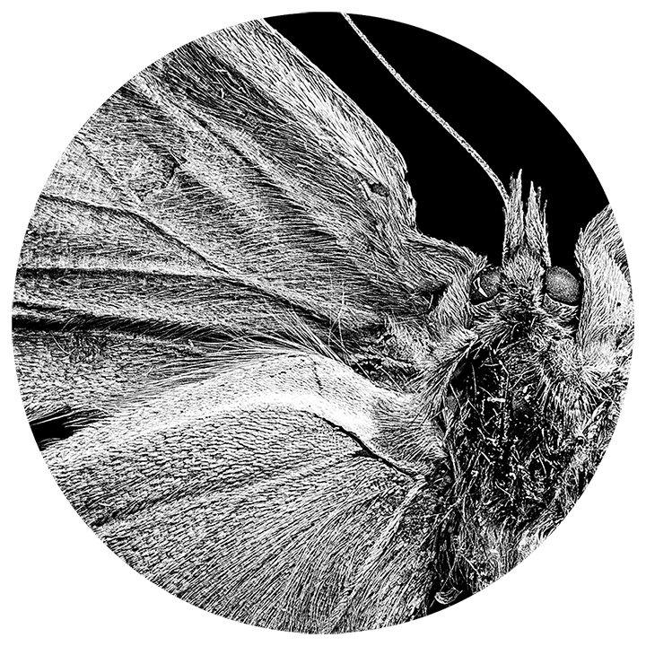 Like white pearls telling of inevitability, the weightless grains of butterfly wing scales leave traces on the black velvet of the artist’s photographs.